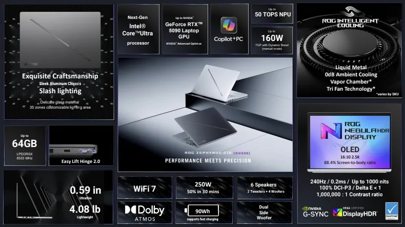 Компания Asus представила обновлённые игровые ноутбуки ROG Zephyrus G14 и G16. Устройства доступны в разных конфигурациях. Обе модели предлагают новейшие процессоры Intel Core Ultra 300, а также AMD Ryzen AI 400. Ноутбуки Asus ROG Zephyrus G14 получили обновлённые OLED-экраны ROG Nebula Display с разрешением 2880 × 1800 пикселей, частотой обновления 120 Гц, пиковой яркостью 1000 кд/м², 100-процентным охватом цветового пространства DCI-P3 (точность цветопередачи Delta E < 1) и сертификатом VESA DisplayHDR True Black 500. В качестве графической подсистемы модель ROG Zephyrus G14 на базе процессоров Intel Core Ultra 300 может предложить вплоть до GeForce RTX 5080. Для ноутбука также заявлены до 64 Гбайт ОЗУ LPDDR5X-8533 и твердотельный накопитель PCIe 4.0 объёмом до 2 Тбайт. Модель на базе процессоров AMD Ryzen AI 400 может предложить дискретную графику GeForce RTX 5060, до 32 Гбайт ОЗУ LPDDR5X-7500 и SSD PCIe 4.0 объёмом до 2 Тбайт. Заявленный показатель TDP модели G14 на базе Intel составляет 130 Вт, у версии на AMD — 100 Вт. Модель ROG Zephyrus G14 на Intel оснащена аккумулятором ёмкостью 90 Вт·ч и поставляется с блоком питания мощностью 250 Вт, для варианта на AMD заявлены аккумулятор ёмкостью 73 Вт·ч и блок питания на 200 Вт. Обе версии ноутбука оснащены шестью динамиками с поддержкой Dolby Atmos и поддерживают Wi-Fi 7. Модель ROG Zephyrus G16 представлена только на платформе Intel. Ноутбук предлагает графику вплоть до GeForce RTX 5090 и до 64 Гбайт ОЗУ LPDDR5X-8533. Заявленный TDP составляет до 160 Вт. В этой модели используется OLED-дисплей с разрешением 2,5K и частотой обновления 240 Гц. Ноутбук оснащён аккумулятором ёмкостью 90 Вт·ч и поставляется с блоком питания мощностью 250 Вт. Asus отмечает, что зарядка батареи от 0 до 50 % занимает около 30 минут. Производитель также выделяет в обновлённых ноутбуках ROG Zephyrus G14 и G16 новый механизм шарнира Easy Lift 2.0, упрощающий открытие и закрытие крышки, обновлённую систему охлаждения с испарительной камерой, тремя вентиляторами с функцией полной остановки при отсутствии нагрузки, а также жидкий металл в качестве термоинтерфейса. Кроме того, компания переработала дизайн ноутбуков, увеличив площадь забора свежего воздуха снизу для системы охлаждения. Также отмечается наличие 35-зонной RGB-подсветки.