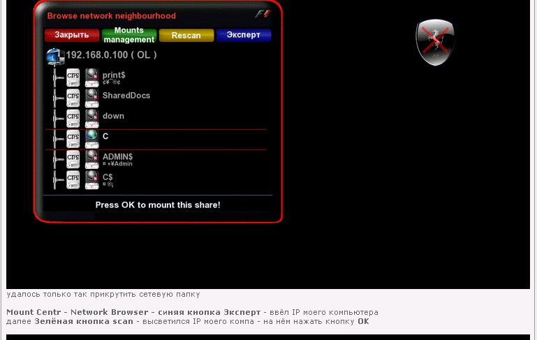 spartakm73 Опубликовано 1 сентября, 2012 Опубликовано 1 сентября, 2012 Там вообще не надо вводить логин и пароль. Главное расшарить папку на компе... Используй монтирование CIFS. Vu+ Duo2, Octagon SF-1028P, Formuler F3, PrismCube Ruby, Openbox S6,S4 Skyway Classic3,Droid2 Loader: I-Boot SW: V21232 Enigma2: MAX-TDT by spartak73/HDMU Mod/PKT Hyperion 5.4 Mod Toroidal T-90 53°E <------>4°W Не учи отца и баста!
