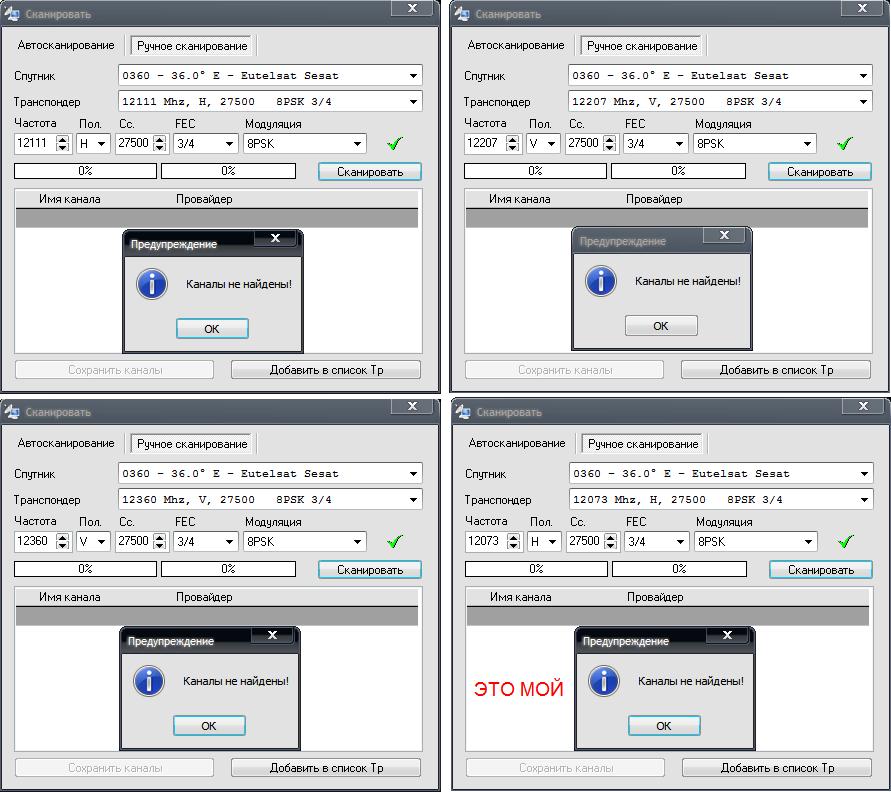 ingo Опубликовано 21 февраля, 2010 Опубликовано 21 февраля, 2010 (изменено) ingo Всё переставил заново. Всё без проблем.... акромя этих 12073, 12111, 12207, 12360............... Блин, здесь где-то Коперфильд сидит/// :blink: :blink: Вобщем проблема осталась. Чё делать не знаю.................. Вот мои скрины: На скринах всё правильно выставлено. У тебя получается карта не видит транспондеры в стандарте DVB-S2. А попробуй модуляцию оставить QPSK и просканируй. Если не поможет, то есть ещё подозрение на саму DVB карту. Возможно при переустановке Винды криво стали дрова. Установи карту заново, может в этом загвоздка. Изменено 21 февраля, 2010 пользователем ingo Skyway Classic 2, SkyStar-2 S2дома: 13Е (Супрал 0,6)36Е (Супрал 0,55)75E-85,2E-90E(Ku) (GS 0,9)на даче:0,8W-4W-4,8E-9Е-13E-19,2Е (Супрал 0,9)36Е-31,5Е (Супрал 0,6)53Е-60Е-66Е (GS 0,9)90E(С) (Супрал 1.20)
